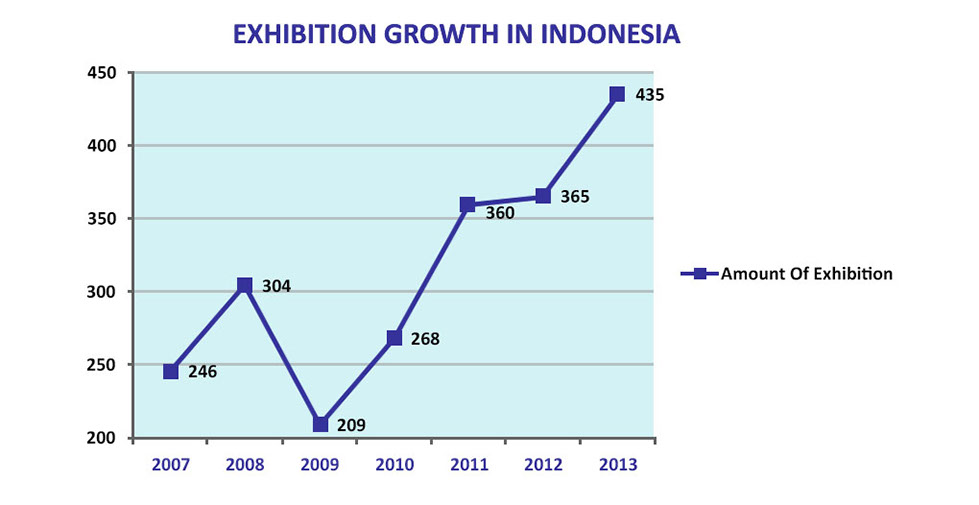Sumber yang sama juga menyebutkan bahwa dalam beberapa tahun terakhir ini penyelenggaraan pameran yang diselenggarakan oleh perusahaan-perusahaan tersebut tampak terus mengalami peningkatan. Apabila pada tahun 2007 pameran yang diselenggarakan oleh perusahaan penyelenggara tersebut baru sekitar 246 pameran, pada tahun 2008 naik menjadi 304 pameran, namun pada tahun 2009 mengalami penurunan menjadi 209 pameran saja. Tetapi setelah itu naik terus dan pada tahun 2013 telah mencapai 435 pameran.