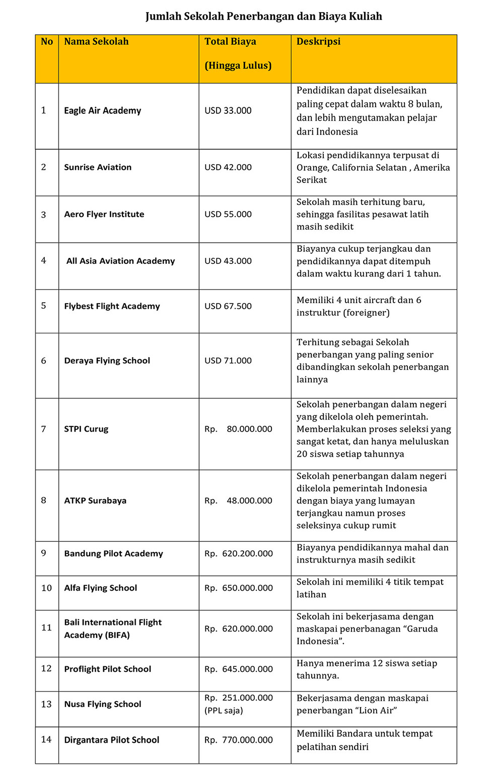 Total biaya pendidikan satu pilot di Indonesia sekitar Rp 500 juta-Rp 700 juta. Untuk menjadi pilot, seorang calon pilot yang bersekolah sekolah penerbangan (flying school) harus menyelesaikan pendidikannya di sekolah penerbangan (flying school), dimulai dari first flight, first solo, first cross country, PPL (Private Pilot License) , CPL (Commercial Pilot License), hingga Multi Engine dan Instrument Rating yang menghabiskan jam terbang sebanyak 150 jam terbang. Berikut uraian jumlah Sekolah Penerbangan beserta biaya kuliahnya.
