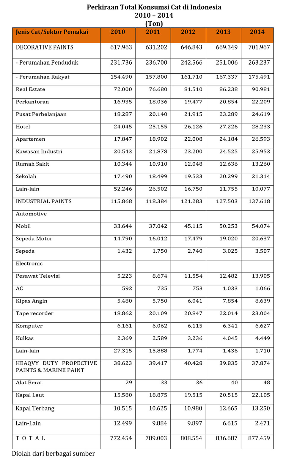 Pada tahun 2010 lalu konsumsi cat di Indonesia kurang lebih mencapai 772.454 ton, kemudian naik terus dan mencapai puncaknya menjadi 836.687 ton pada tahun 2013. Pada tahun 2014 naik lagi menjadi 877.459 ton. Pemakai terbesar cat selama ini adalah sector industry property sebesar 701.967 ton pada tahun 2014, atau mengalami kenaikan sebesar 4.87% dibanding tahun sebelumnya yang tercatat sebesar 669.349 ton, atau naik lebih tinggi lagi jika dibanding 2 atau 3 tahun sebelumnya.